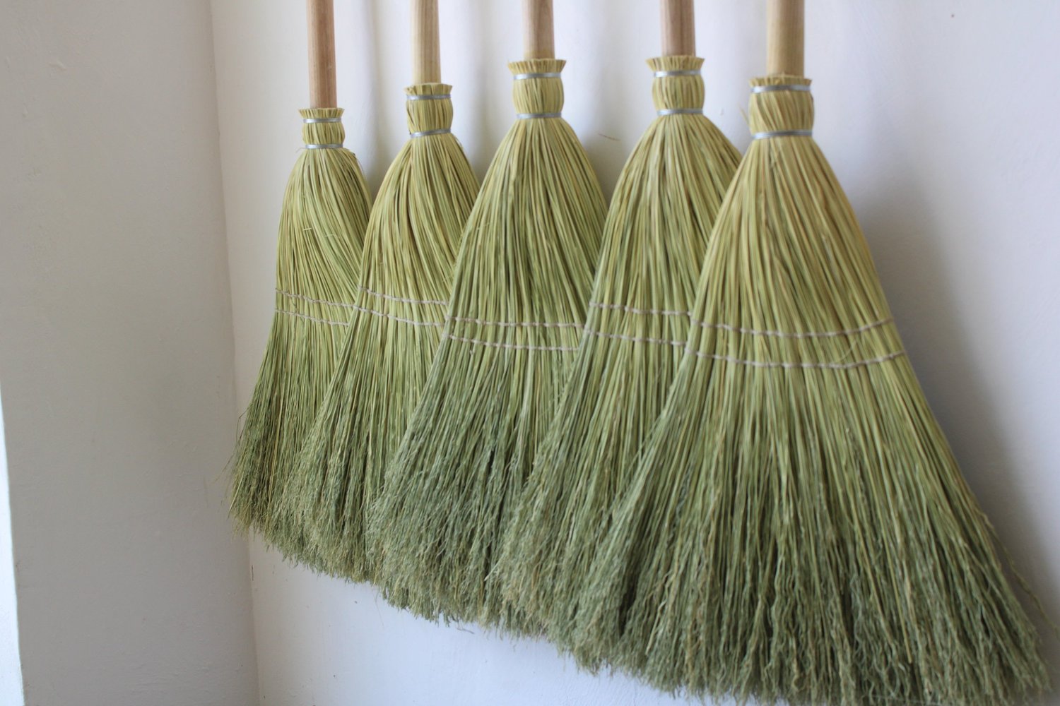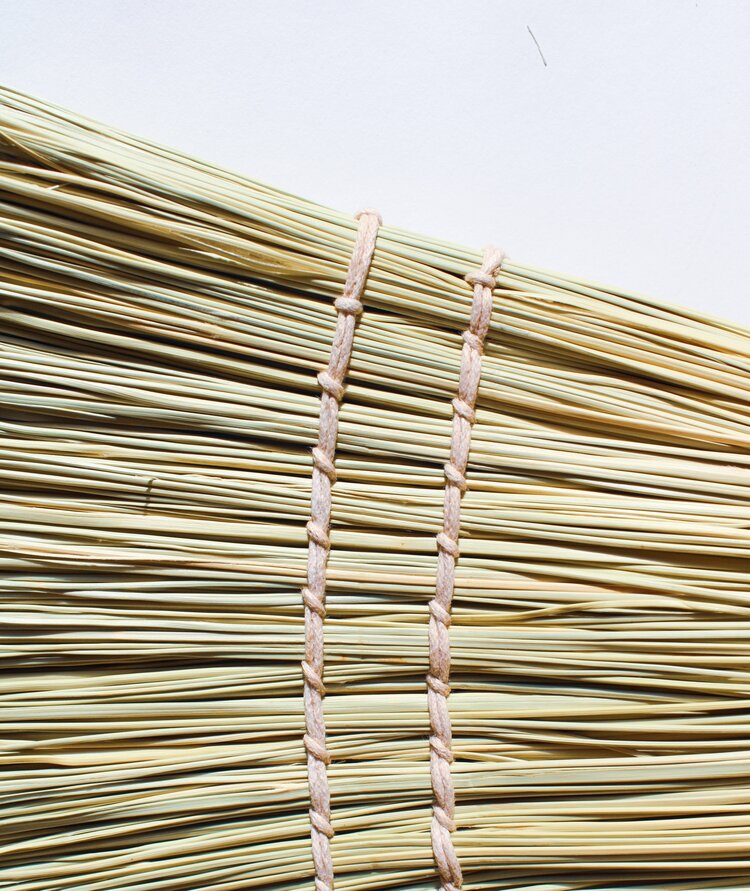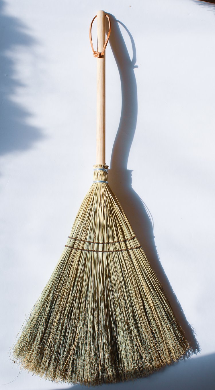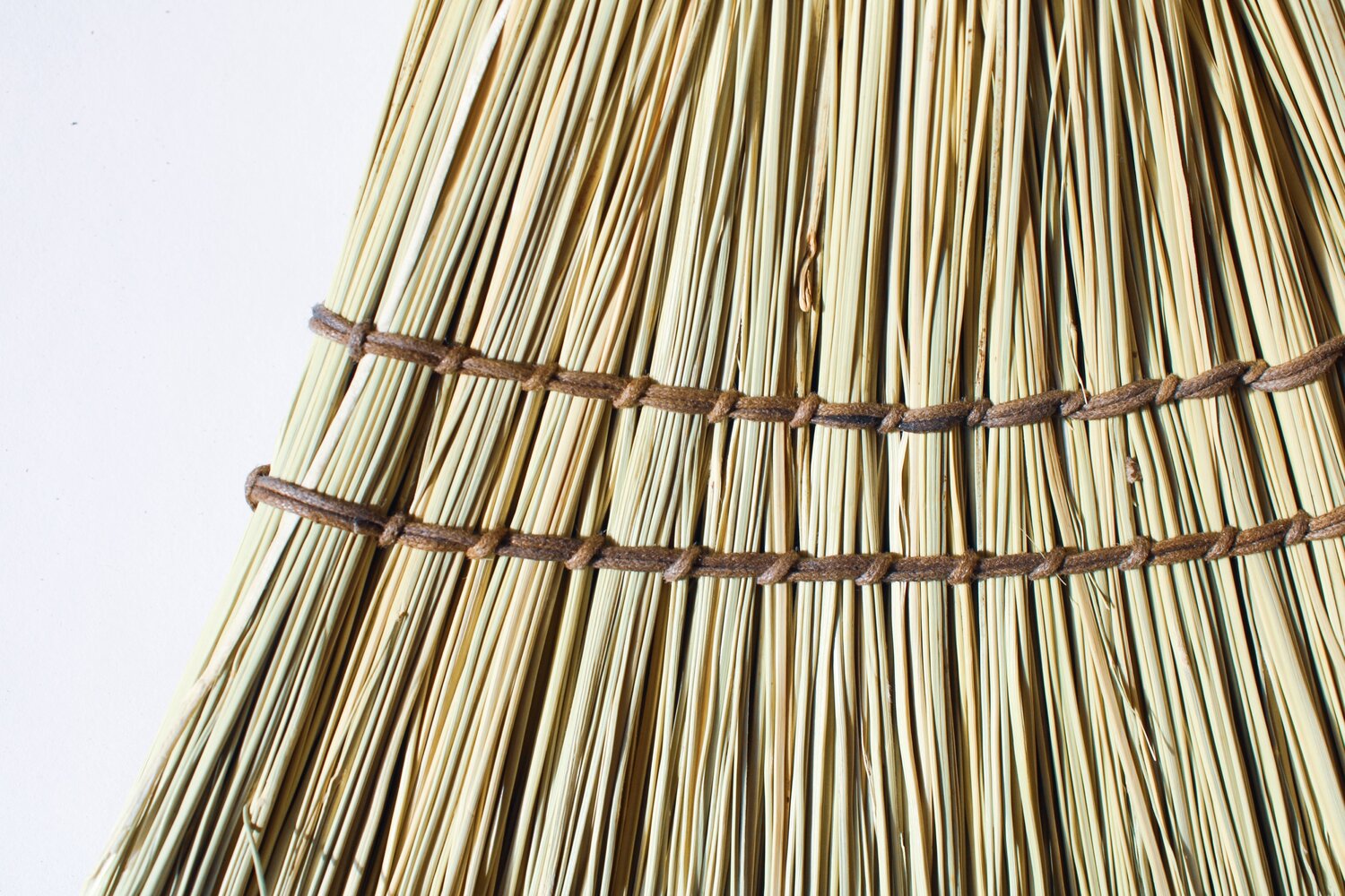 It’s a classic! This far-reaching loose sweep picks up dirt and dust better due to the split ends left on the broom, making for a soft and effective sweeper. Bound by hand on a turn of the century kick winder with a steel wire on an untreated Ash dowel. Hand-stitched organic cotton flat- weaving on a hand cranked restored stitcher. Leather hang tie, feel free to request a woven band one in the notes at checkout. Natural dyed options now available