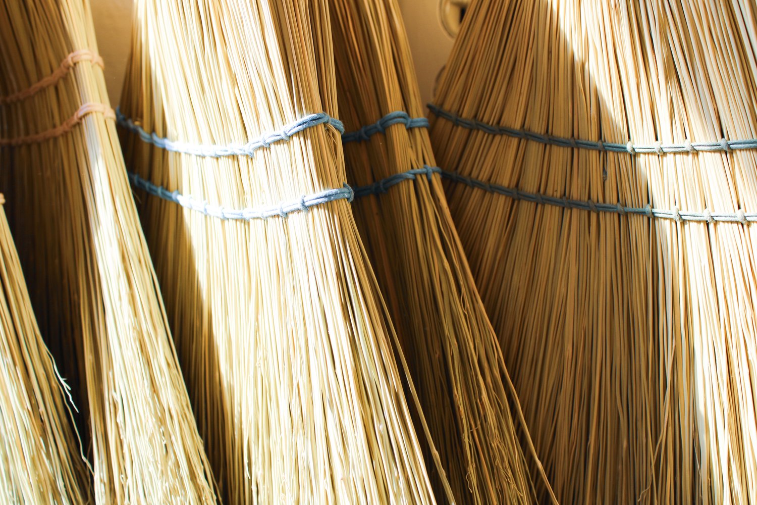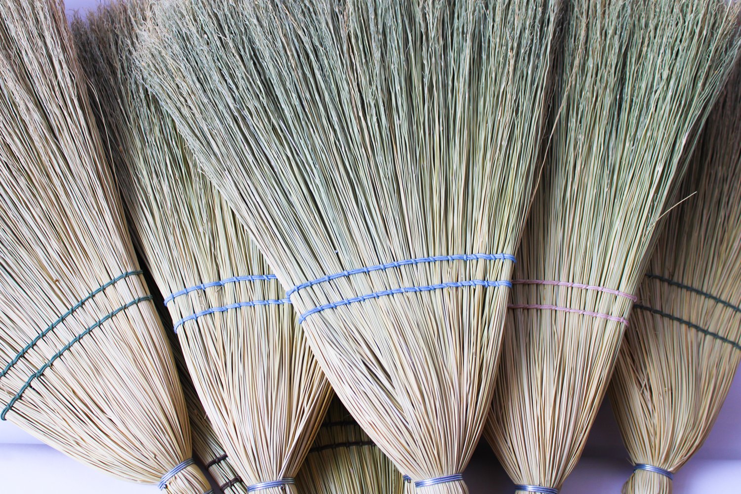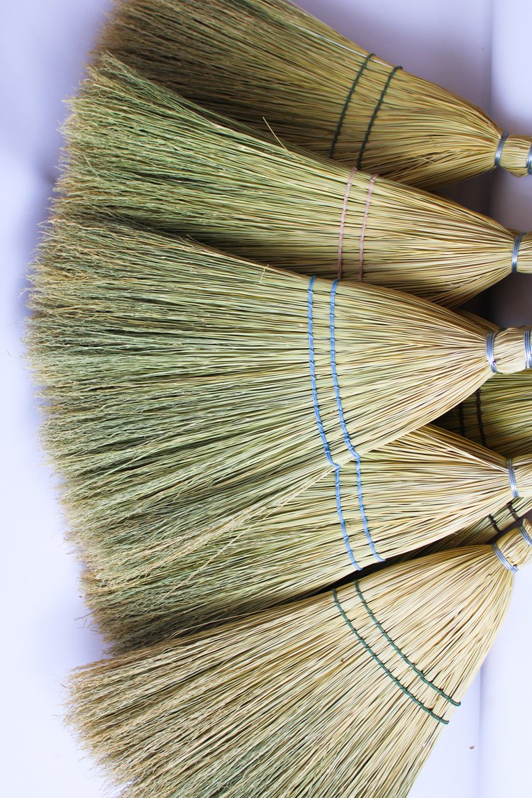 It’s a classic! This far-reaching loose sweep picks up dirt and dust better due to the split ends left on the broom, making for a soft and effective sweeper. Bound by hand on a turn of the century kick winder with a steel wire on an untreated Ash dowel. Hand-stitched organic cotton flat- weaving on a hand cranked restored stitcher. Leather hang tie, feel free to request a woven band one in the notes at checkout. Natural dyed options now available