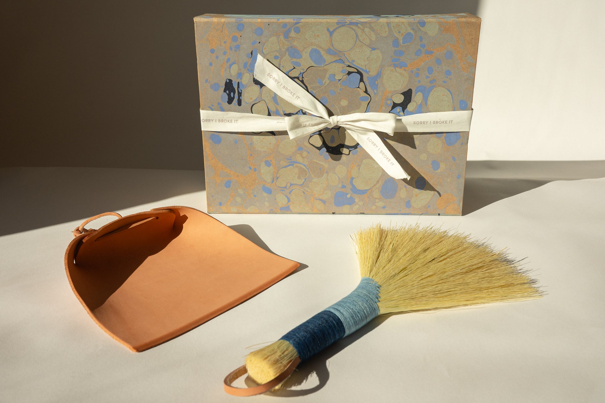 Break a cup at a party? Want to bring magic or good luck to a friend’s home? Our super cute house made tampico organic linen and cotton turkey wing broom and leather dustpan together set in a cute box that either says “sweeping in the good” or “sorry I broke it”.