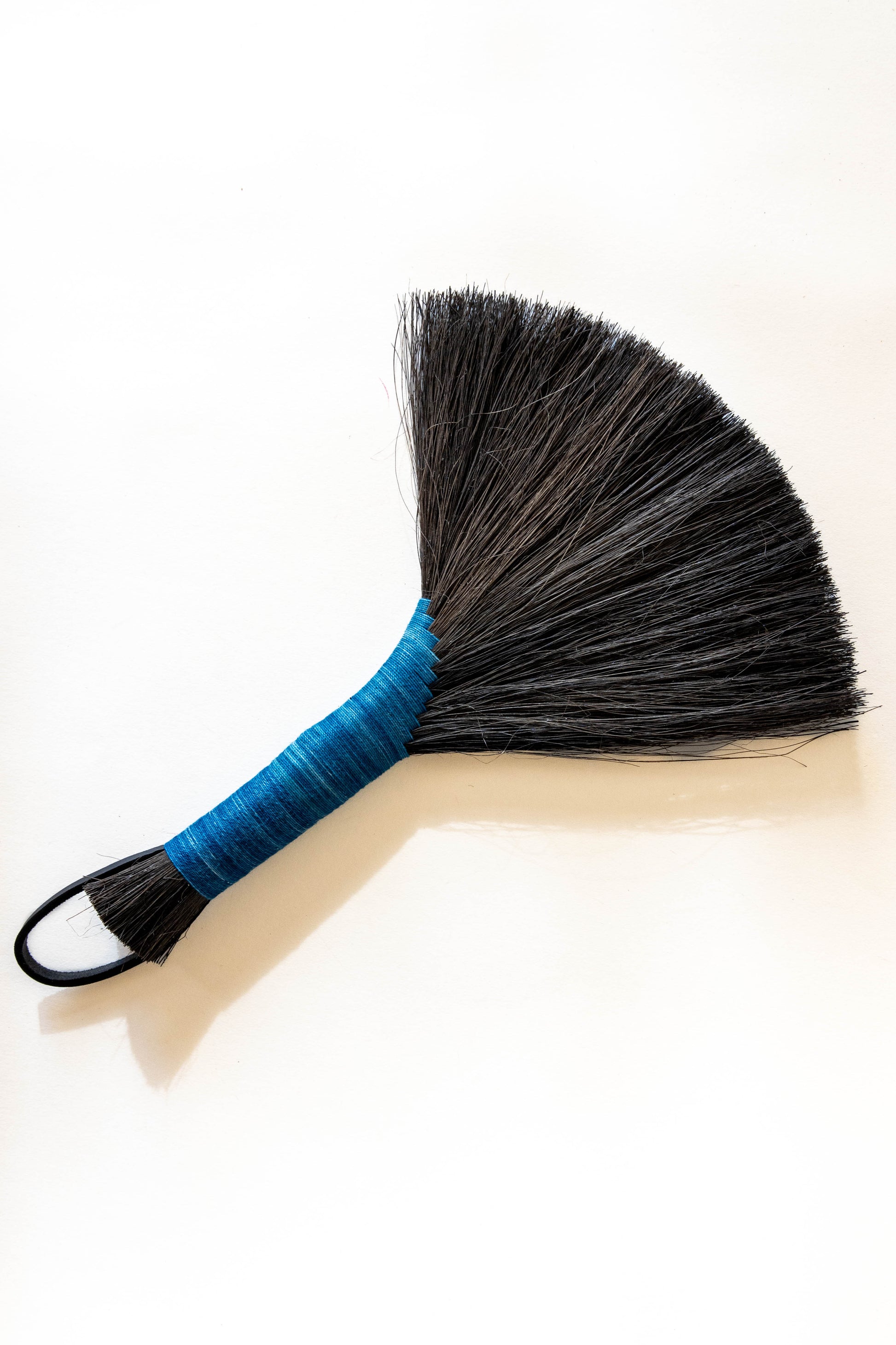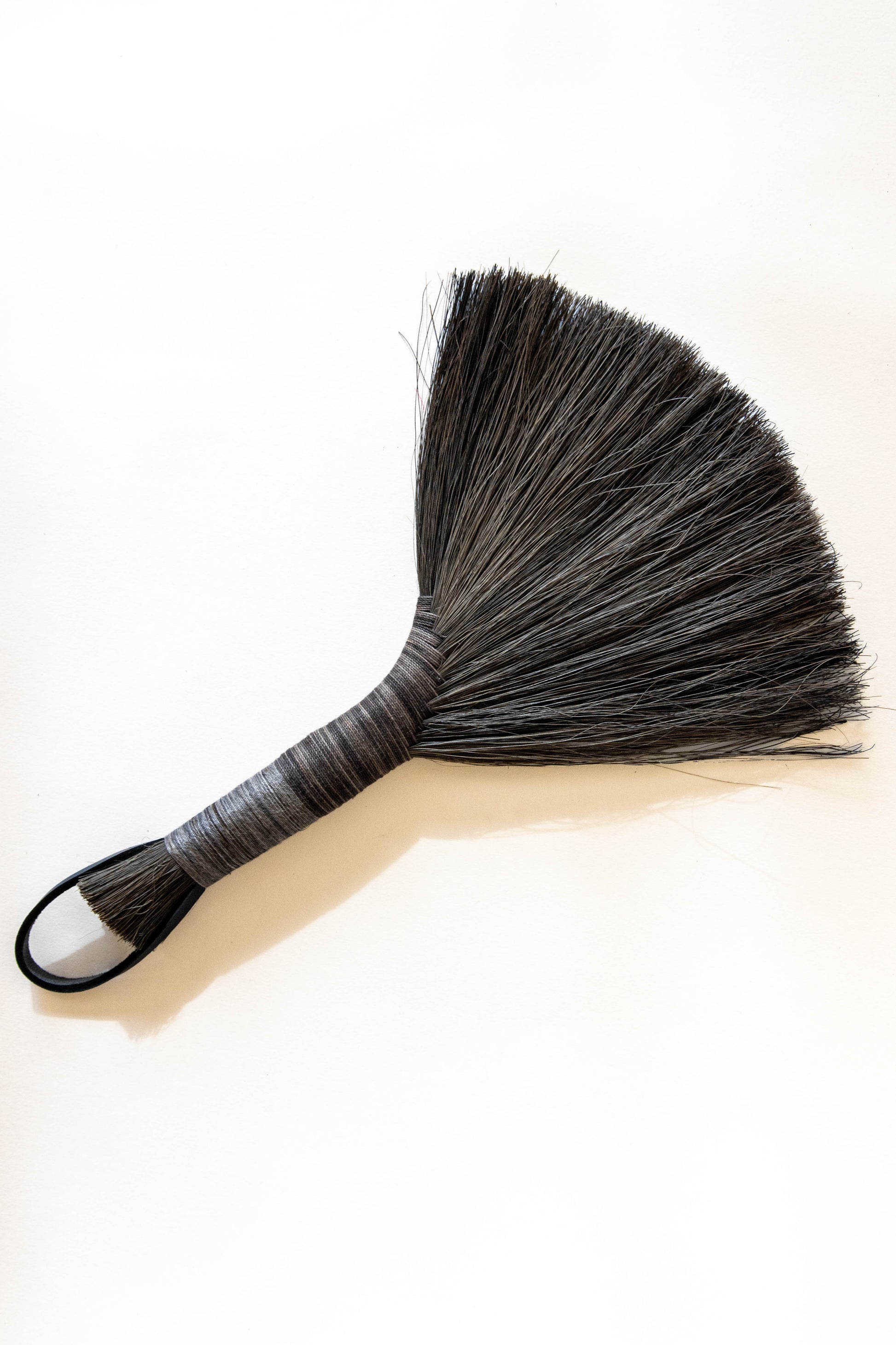 This is a softer sweep than the broomcorn brushes, and is perfect for tabletop, or light dusting. In house natural dyed tampico on the darker brushes and in house natural dyed leather cord on dark dyed brushes.