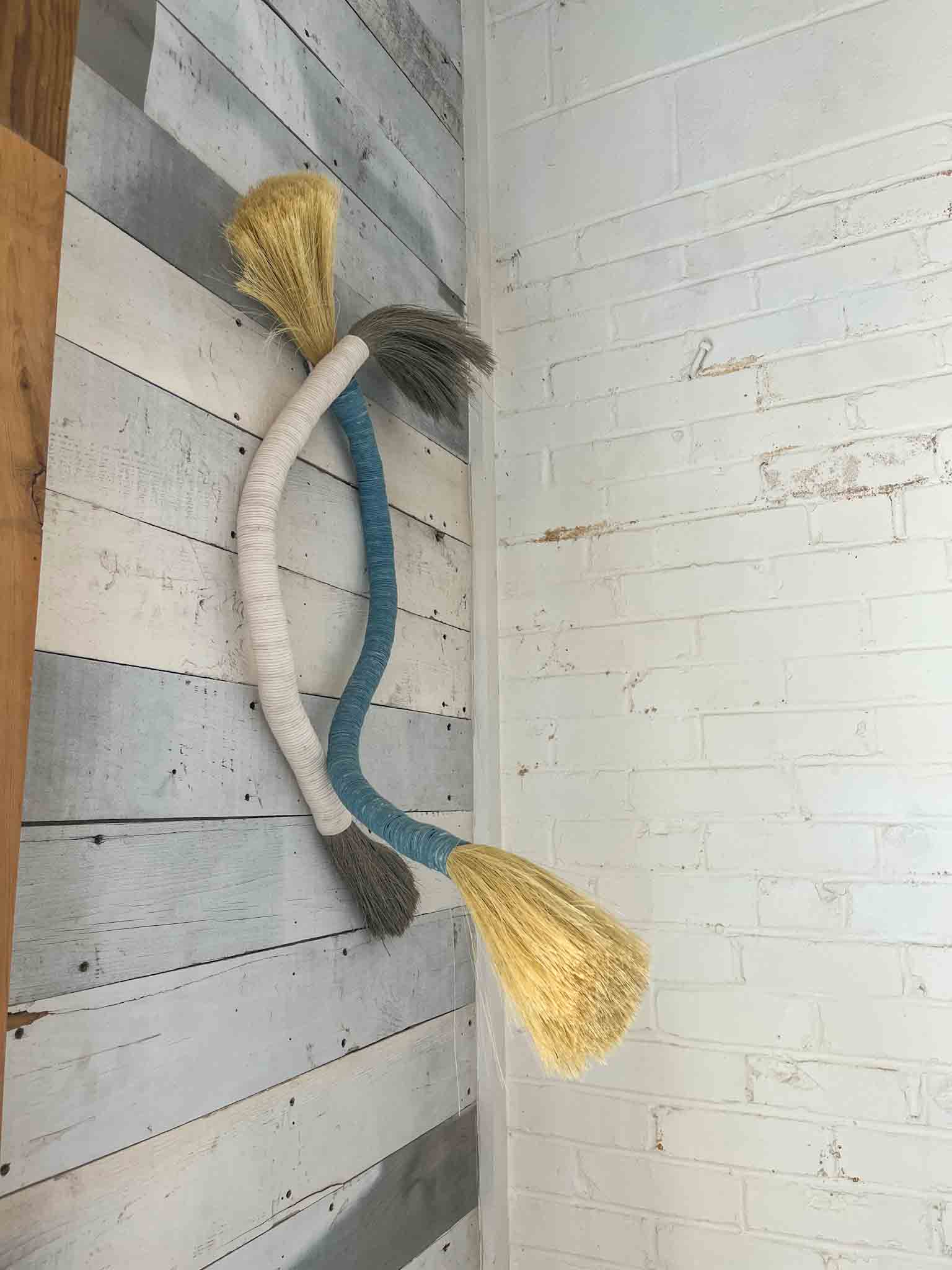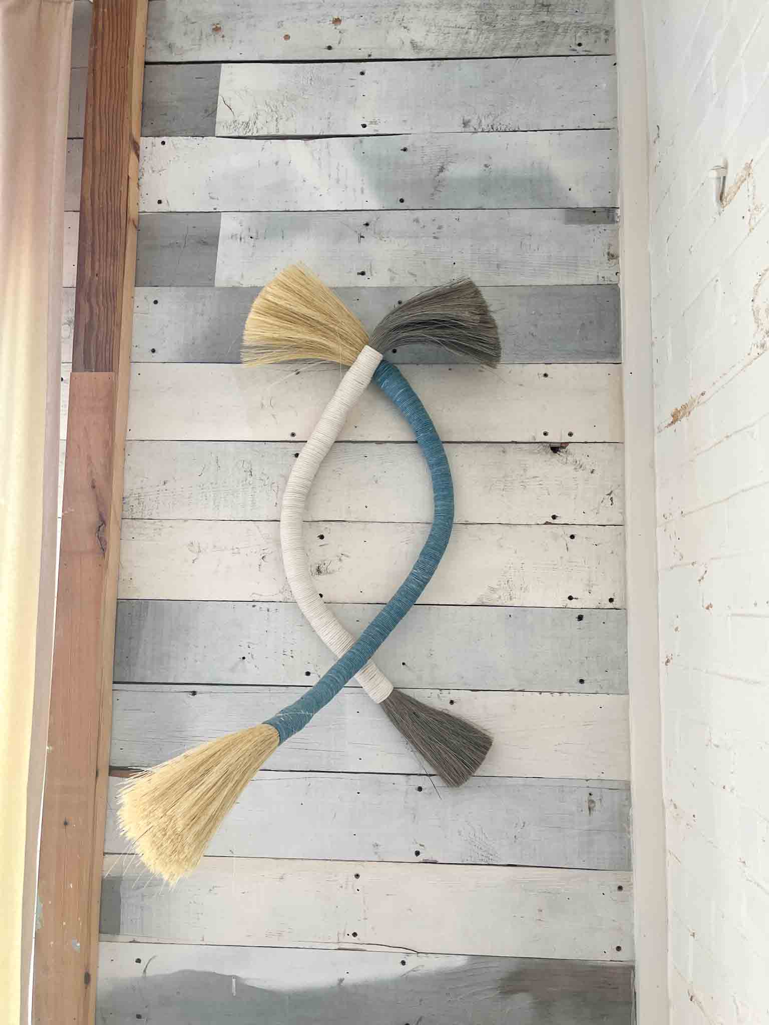 A flexible, bendable woven wall pice that holds its shape! Like to play with your art? These stretched out versions of a tampico brush are a fun textural addition to a wall. Made of natural dyed cord and tampico fiber, it’s the bigger, wall version of a brush, I suppose you could sweep with them too!