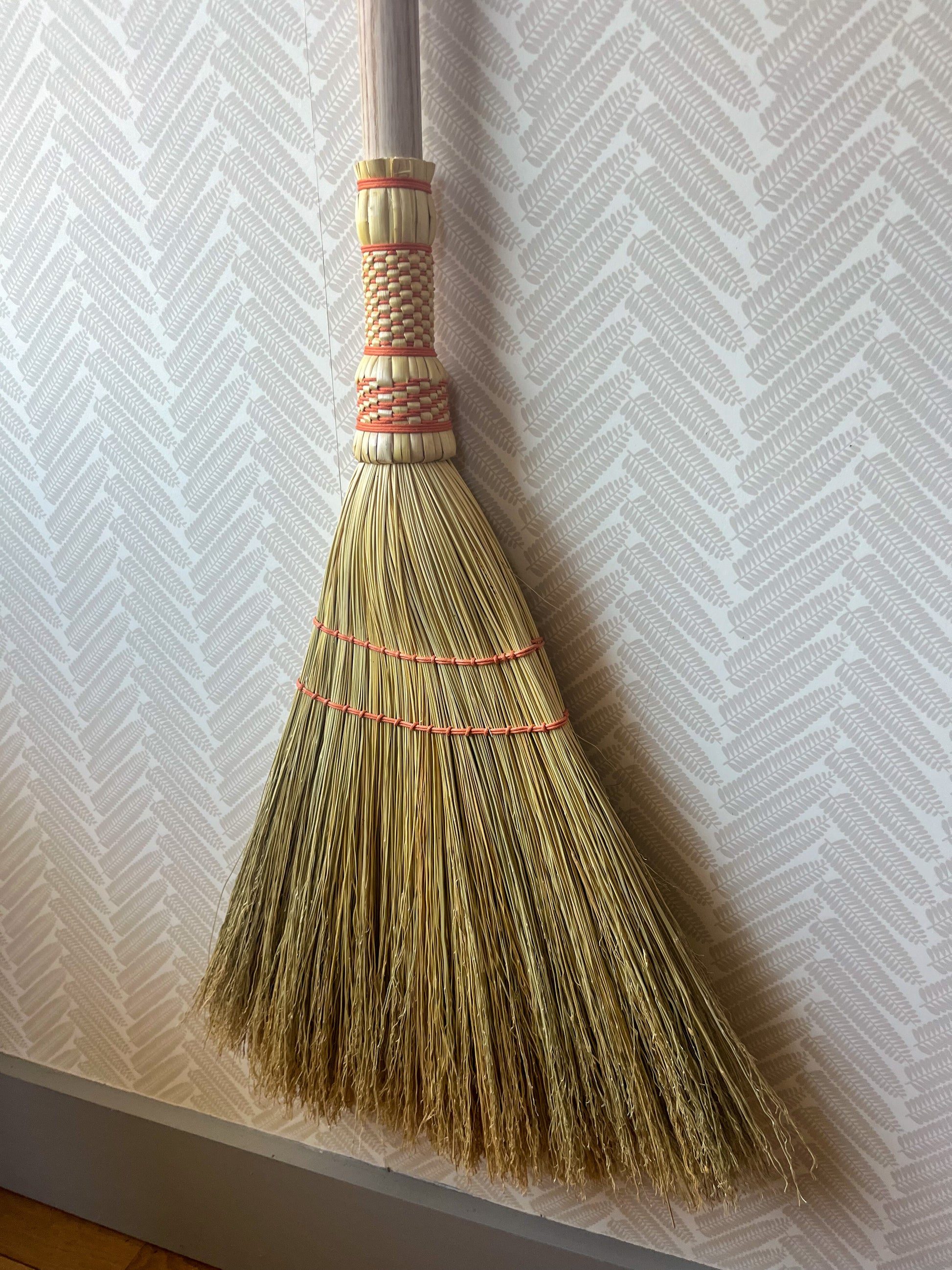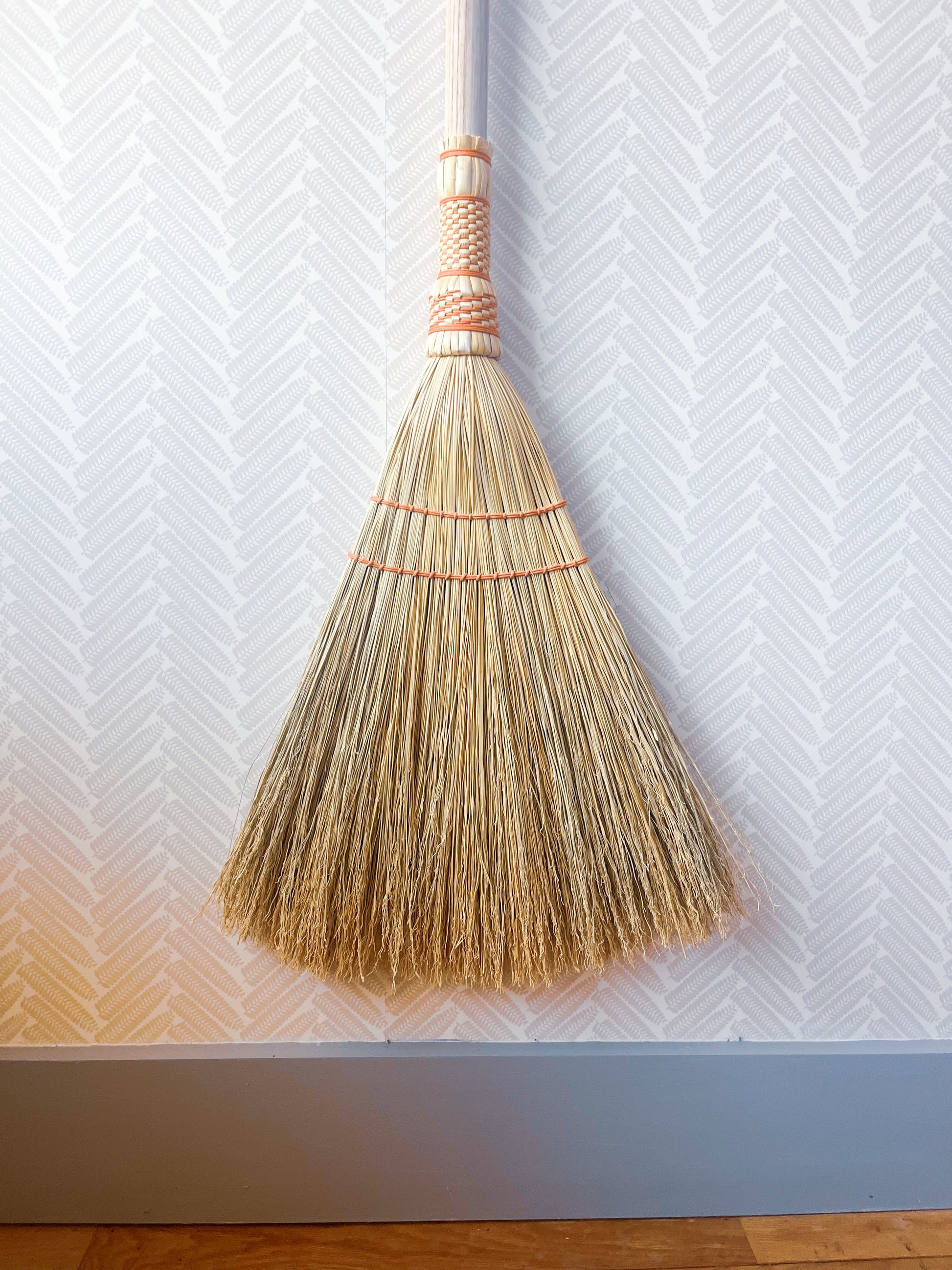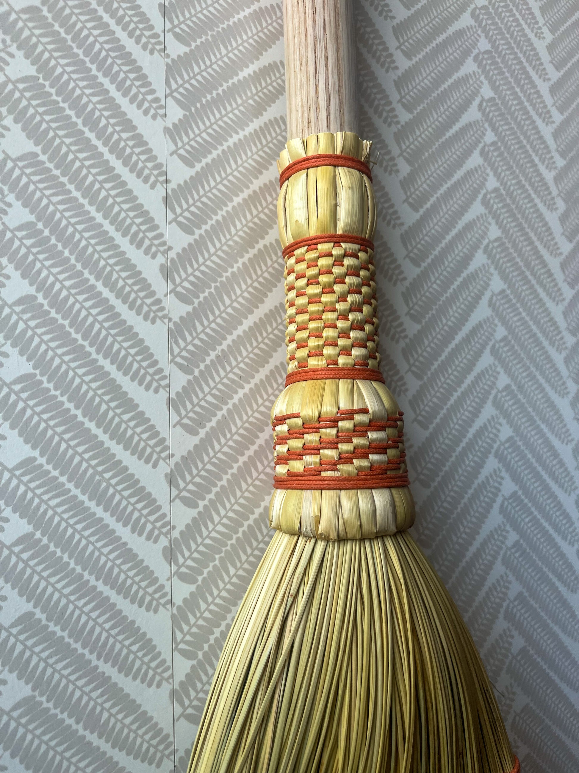 A classic Appalachian weave in cotton on top of a farmhouse style broom. This far-reaching loose sweep picks up dirt and dust better due to the split ends left on the broom, making for a soft and effective sweeper. Bound by hand on a turn of the century kick winder with a steel wire on an untreated Ash dowel. Hand-stitched cotton flat- weaving. Leather hang tie, feel free to request a cotton one in the notes.